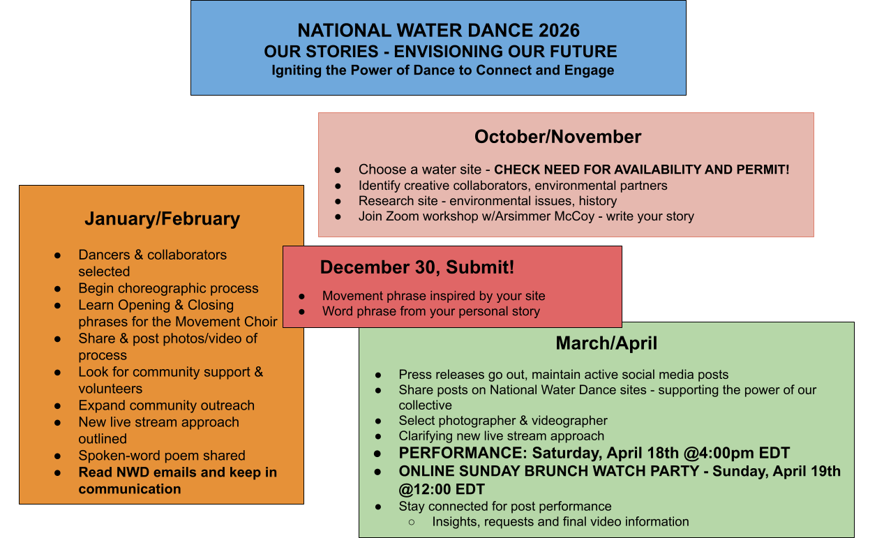 - Submit your 3-10 second gesture/movement phrase inspired by your water site by December 30, 2025 (this is not a requirement to participate, but we encourage everyone to share their unique movement!). Email your gesture/movement phrase to: dandree@nationalwaterdance.org